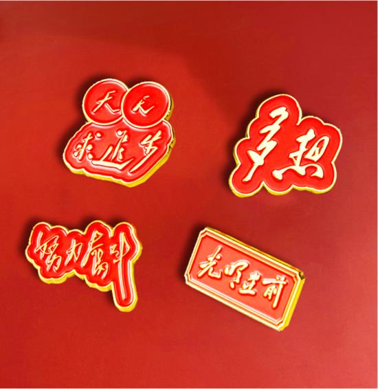 “大志”系列徽章,以毛主席书法作品和名言警句为创意源泉,保留了原书法作品的神韵,又改变以往中规中矩的造型,衍生设计出不同的产品造型,以物明志,传递一种积极向上的力量,激发奋斗的信心和动力。